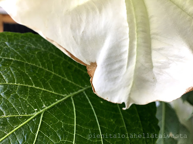 Illalla pöytää valaisevat kynttilät tai aurinkokennovalaisimet. Haaveilen ripustavani LED -valoverkon "tähtitaivaaksi" tuijan alaoksiin, mutta sähköä ei tuolla pihan alueella ole ainakaan vielä.
